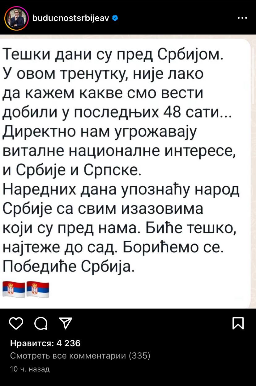 «Сейчас мне непросто сказать, какие новости мы получили в последние 48 часов. В ближайшие дни я ознакомлю народ Сербии со всеми вызовами, которые нам предстоят. Будет тяжело, как никогда тяжело. Мы будем бороться. Сербия победит.» – говорится в публикации.