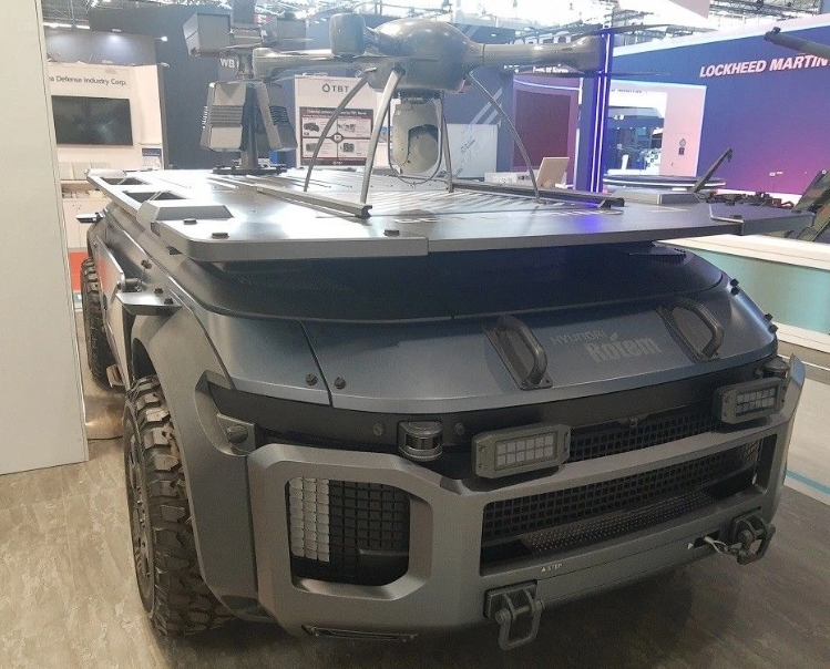 На стенде также демонстрируется беспилотная наземная техника. Меньший из них имеет полностью электрический привод и уже проходит испытания в армии Республики Корея. Он также вооружен дистанционно управляемым боевым модулем с пулеметом.