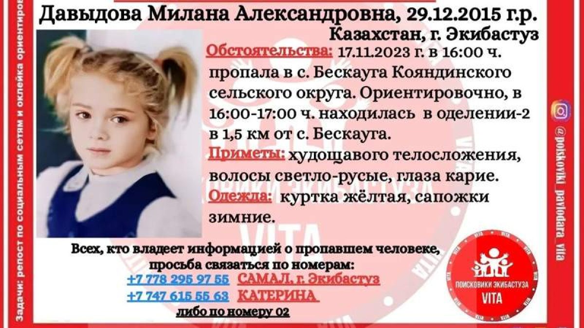 В Павлодарской области без вести пропавшую семилетнюю Милану Давыдову нашли мертвой, передает Sarbaz.kz со ссылкой на Zakon.