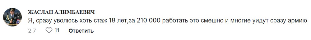 «Я сразу уволюсь, хоть стаж 18 лет, за 210 000 работать это смешно. Многие сразу уйдут из армии», – написал пользователь TikTok Жаслан Алимбаевич