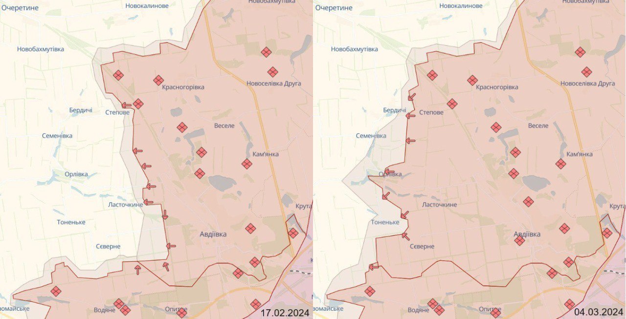 Авдеевка стала первой значительной российской победой с мая 2023 года. Украинская армия, покинув город, заявила, что построила оборонительные линии за пределами города. Но российские войска за неделю захватили три села к западу от Авдеевки и борются как минимум за еще одно.