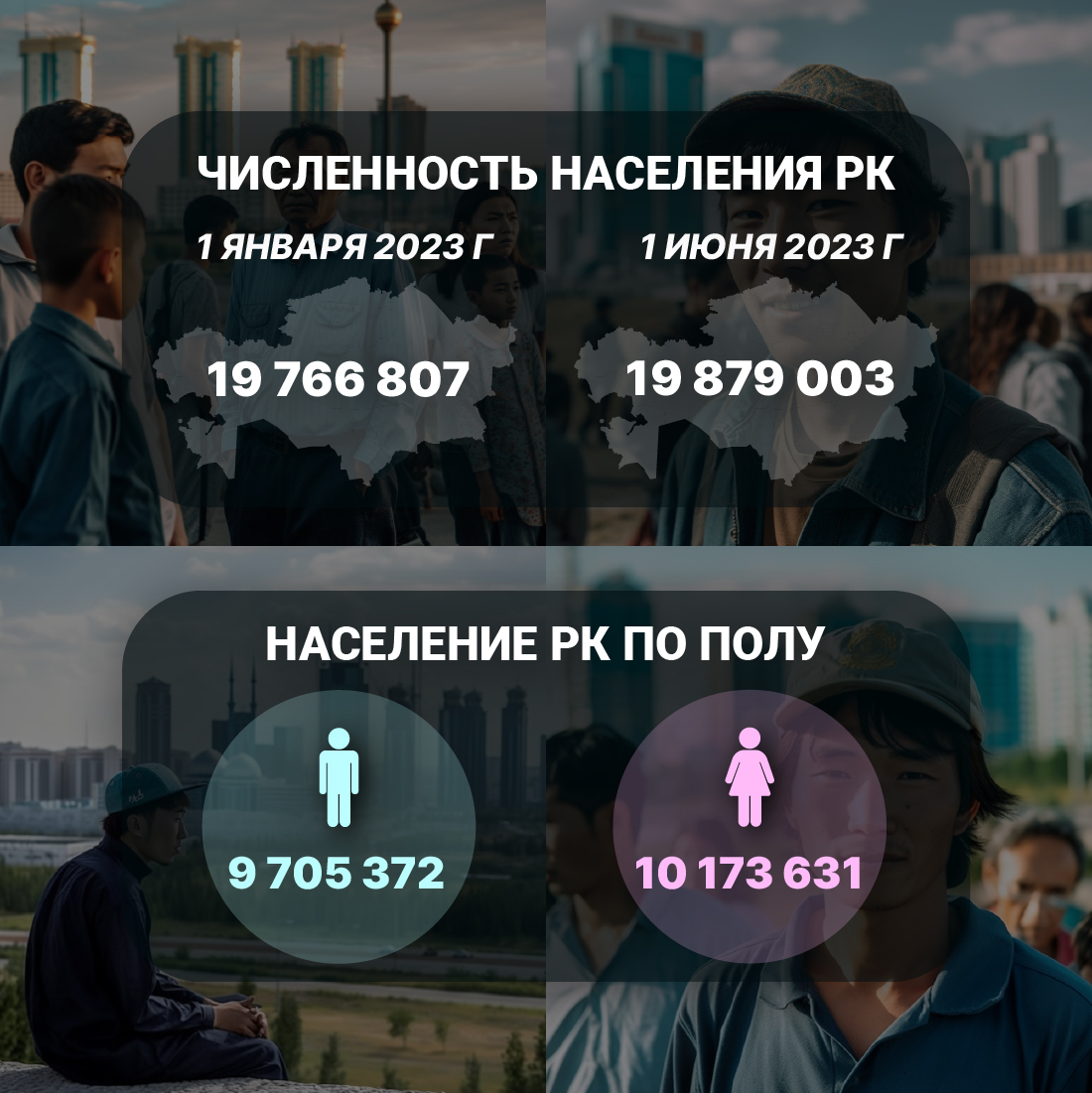 Всего же численность населения Казахстана на 1 июня текущего года составила 19 879 003 человека. С начала года численность населения увеличилась на 112 196 человек.