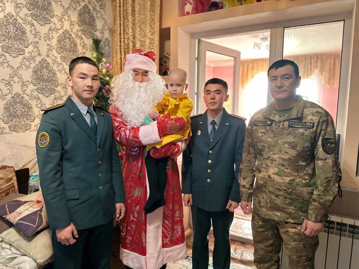• Новый год – время чудес и исполнения желаний! В этот прекрасный праздник просто необходимо, чтобы каждый ребенок испытал искреннюю радость от встречи с чудом. И зная, что эта вера в чудо придаст маленьким пациентам больше сил и уверенности в победе над болезнью, мы решили сделать подарок для маленькой Амиры. Она - настоящий боец, долгих 9 месяцев она проходила лечение в клинике, вот только под новый год вернулась домой, к родным. И мы сегодня постарались исполнить ее Новогоднюю мечту. Желаем ей скорейшего выздоровления! - отметил заместитель командира 1 батальона по воспитательной и идеологической работе подполковник Муратбек Кулшаев.