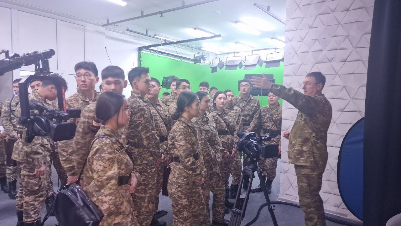 Заместитель начальника Медиа-контент центра полковник Роман Казунин познакомил студентов с производственным процессом творческого коллектива – студией звукозаписи и видеозаписи. Он рассказал, что здесь создаются все видеоролики, подкасты и другие медиапродукты, касающиеся деятельности Вооружённых Сил Казахстана. Также он продемонстрировал мобильную телевизионную станцию, предназначенную для съёмки различных полевых учений, и объяснил её функциональные возможности.