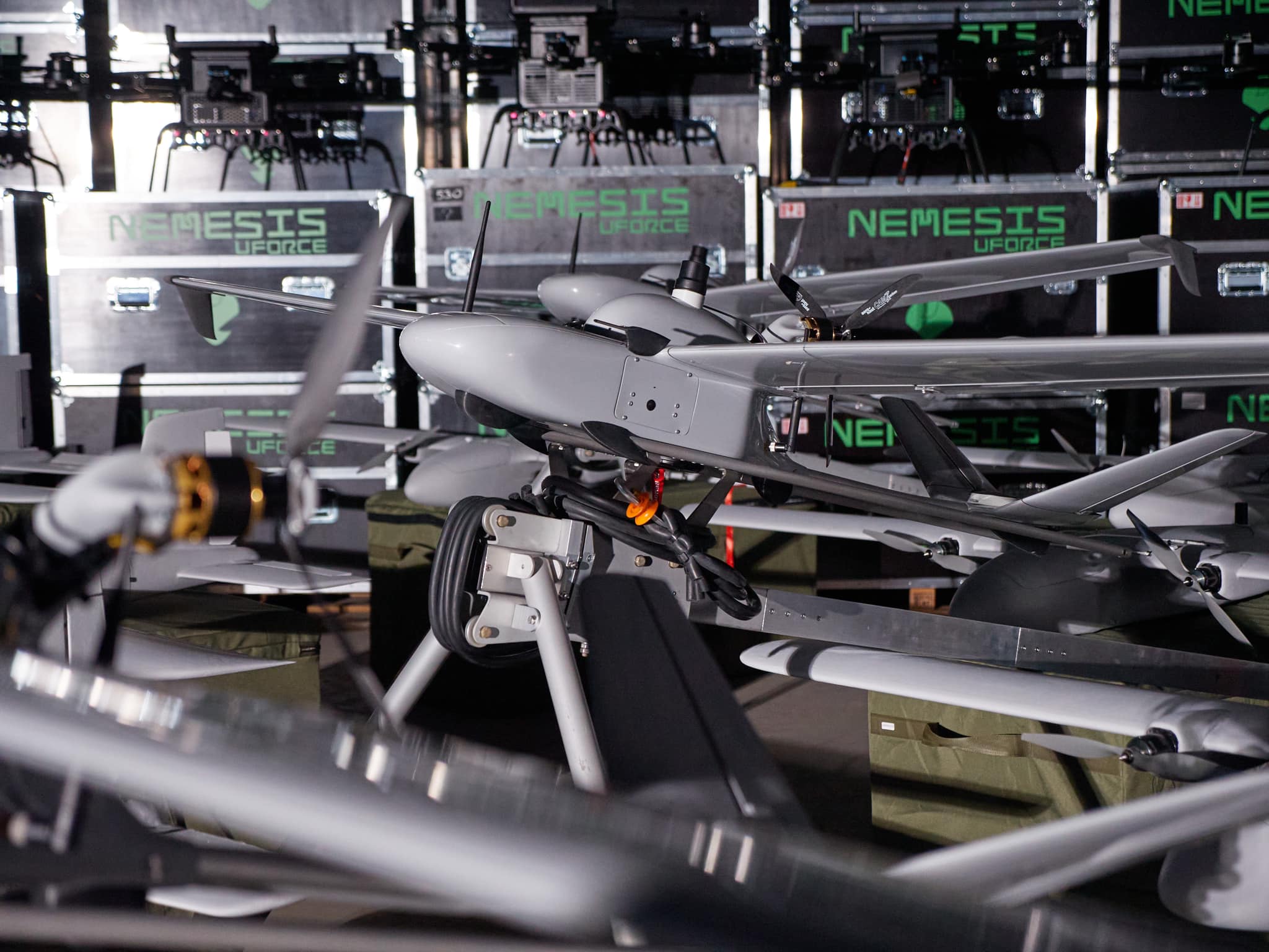 На кадрах демонстрируются квадрокоптеры DJI Mavic 3, бомбардировщики Nemesis и Vampire, а также ударный беспилотник Avenger.
