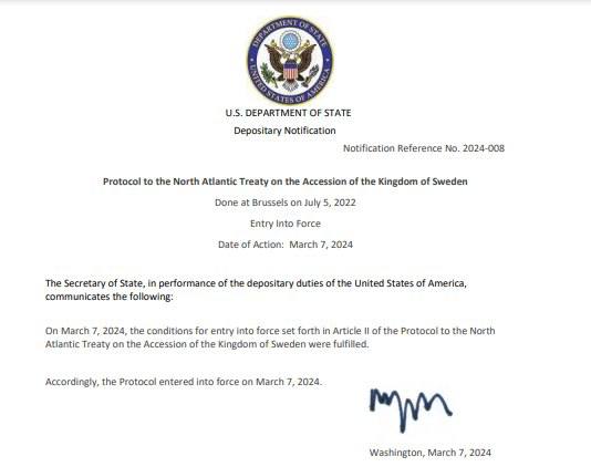 О вступлении в силу документов о присоединении Швеции к альянсу в четверг, 7 марта, сообщил Госдепартамент США, передает Sarbaz.kz.