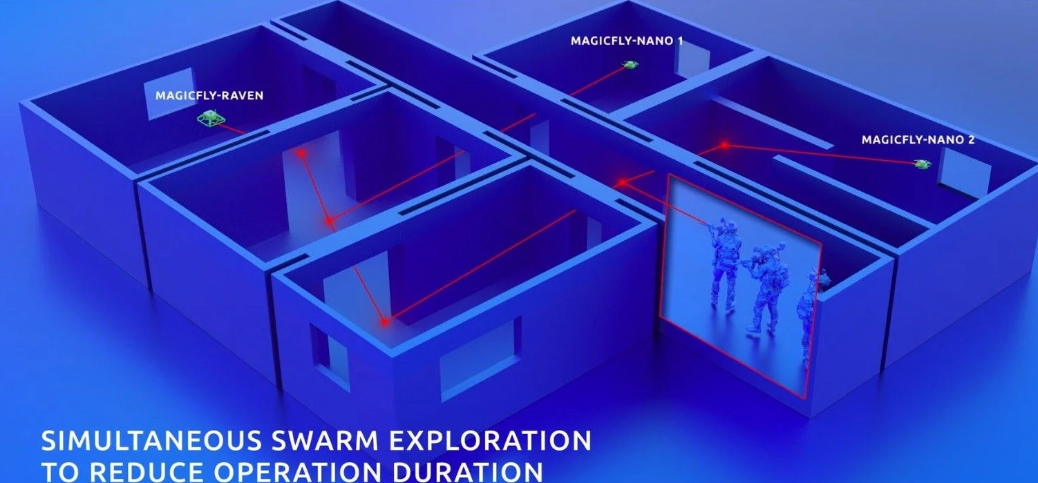 Вторым решением, полезным при работе в закрытых помещениях и представленным на оборонных выставках, стал миниатюрный квадрокоптер MagicFly Nano. Этот микродрон, умещающийся на ладони, предназначен для распознавания пространства перед солдатом, повышая его ситуационную осведомленность даже при отсутствии сигнала GPS. Датчики, размещенные в этом беспилотном аппарате, позволяют ему работать в автономном режиме, самостоятельно объезжая препятствия, картографируя помещения и обнаруживая там объекты и людей. MagicFly Nano может действовать стаей, благодаря чему солдаты могут одновременно распознавать больше помещений в здании.