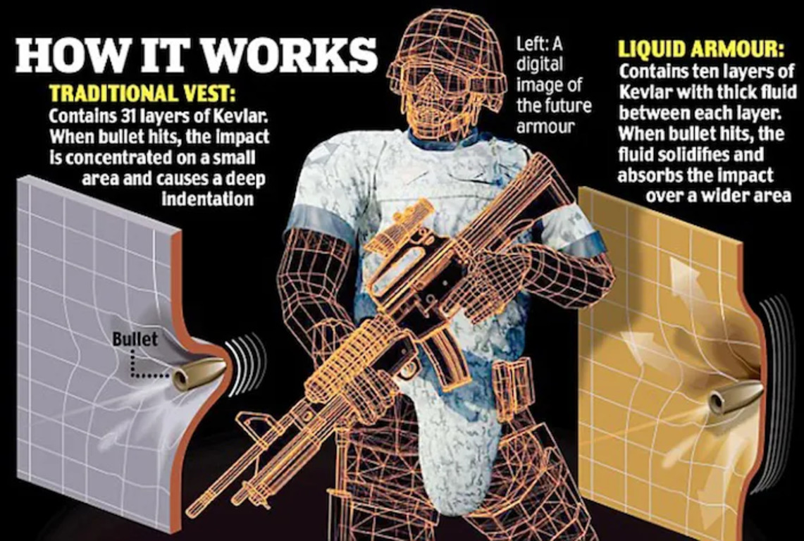 Жидкая броня – одна из самых современных достижений военных технологий, находится в Исследовательской лаборатории армии США. Броня состоит из волокон сверхпрочного материала – кевлара, пропитанного специальной жидкостью-загустителем. Эта жидкость известна также, как неньютоновская жидкость. По свойству она имеет меньший вес. Испытания показали, что при приложении грубой силы материал затвердевает. В жидкой броне при попадании пули молекулы сжимаются, предавая защитному обмундированию необычайную прочность. Ко всему прочему, жидкая броня более устойчива к ударам различными предметами, к примеру, ножом. Такое изобретение будет полезным, как для военных, так и для сотрудников полиции и работников других правоохранительных органов.