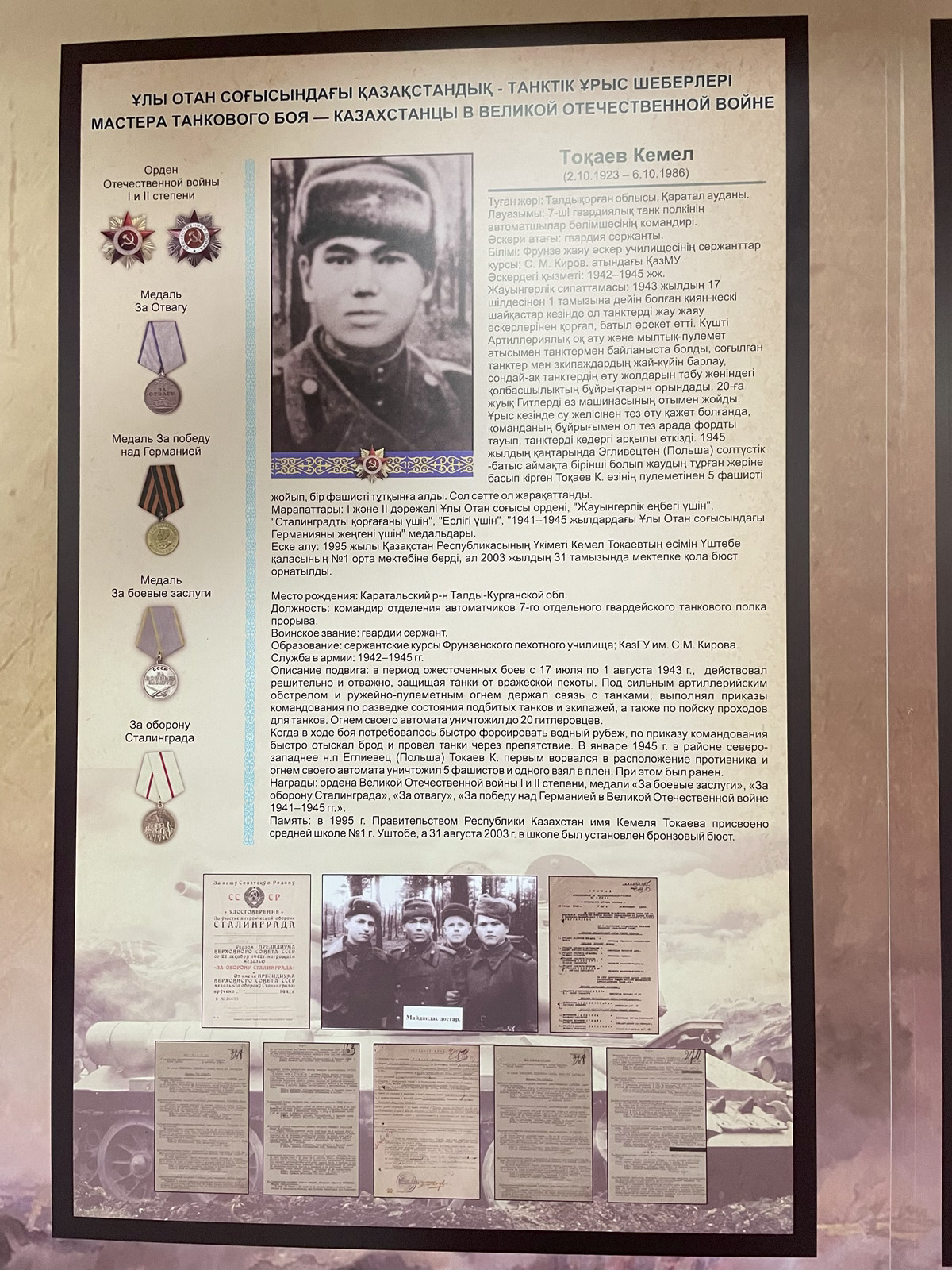 Кемель Токаев окончил сержантские курсы Фрунзенского пехотного училища. Танкист воевал с 1942-го года по 1945-й год. Занимал должность командира отделения автоматчиков 7-го отдельного гвардейского танкового полка прорыва. Экспозиция, посвященная Кемелю Токаеву, находится в зале «Истории танковых войск» в столичном военном музее.
